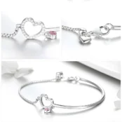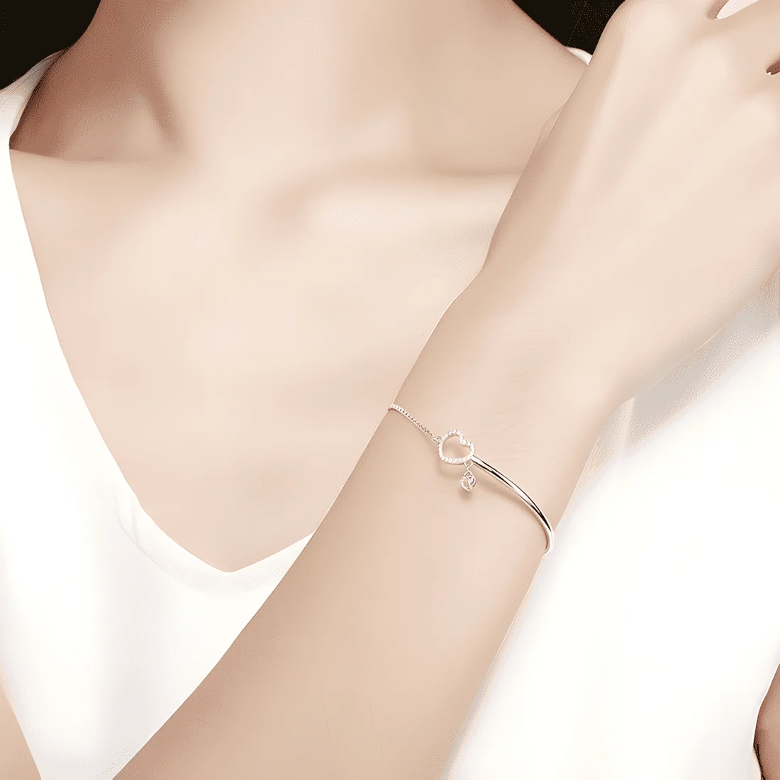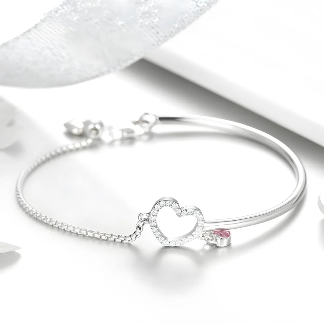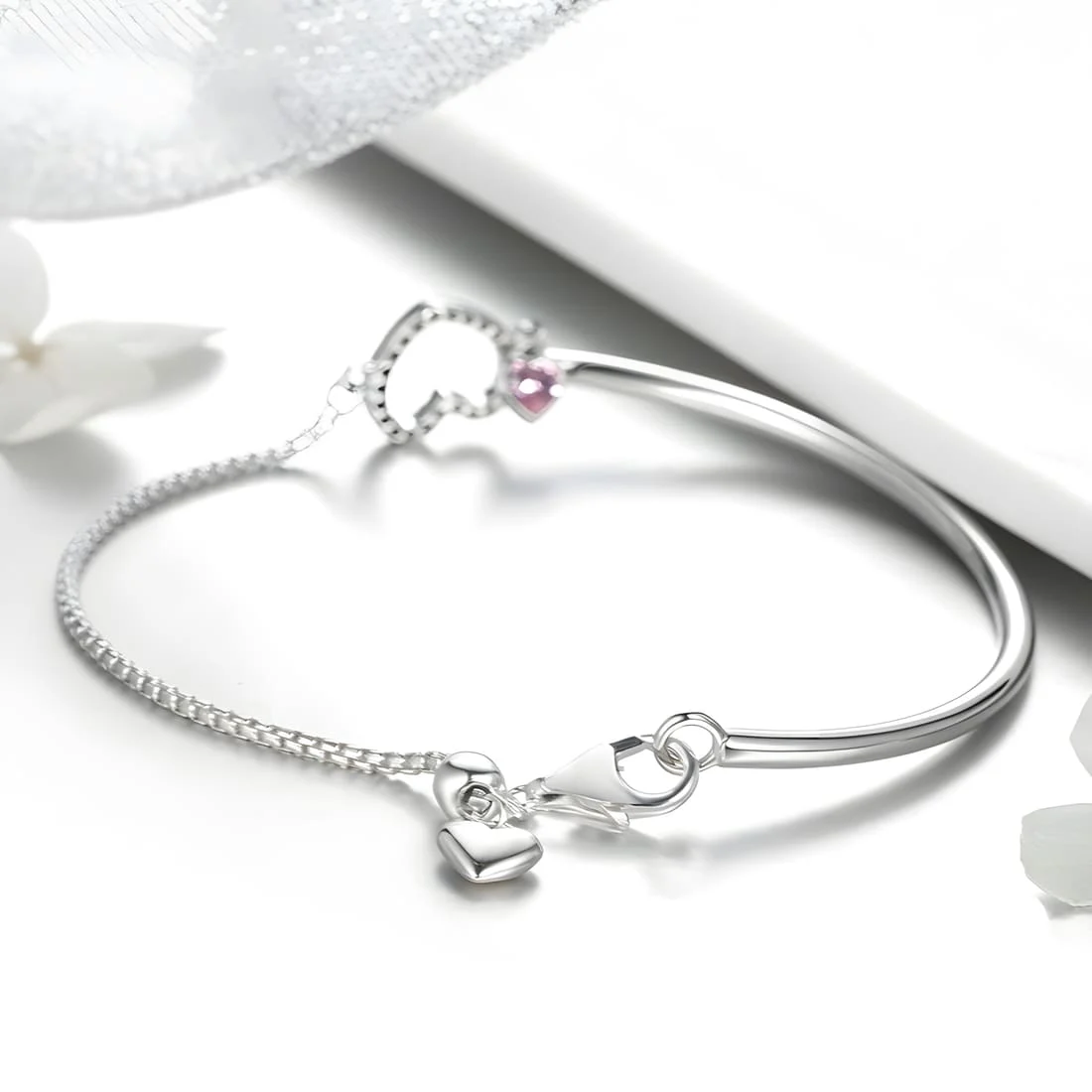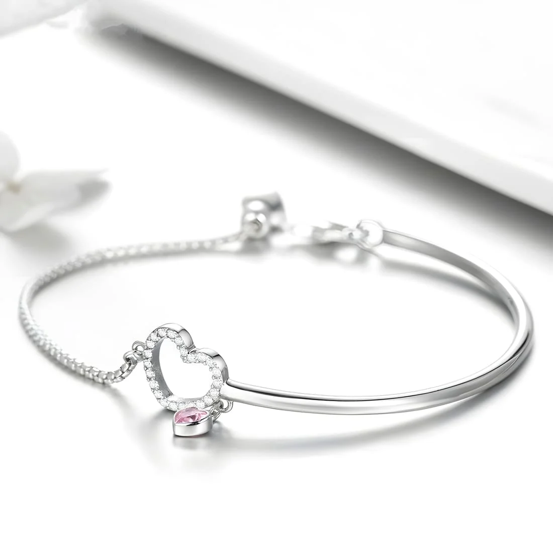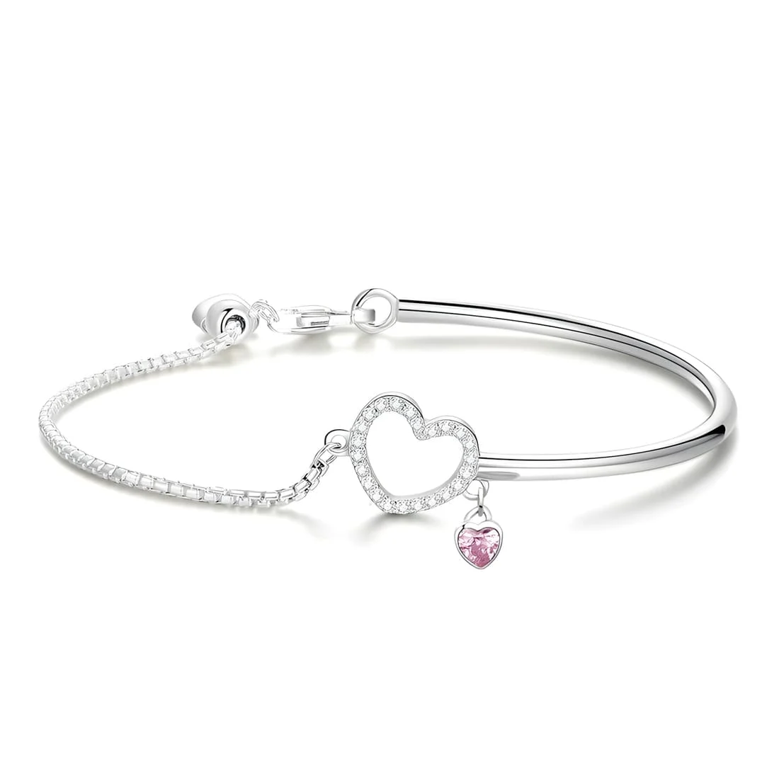 Brilliant Hearts Bracelet 925 Sterling Silver, white gold plated, half bangle with cubic zirconia and adjustable length