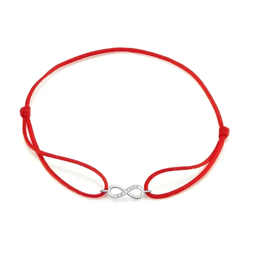 Infinity Bracelet 925 Sterling Silver, white gold plated, with cubic zirconia and red sailor cord – adjustable