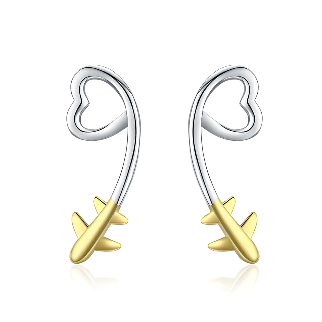 Airplane Heart Earrings, 925 Sterling Silver, white gold plated, with yellow gold plated airplane detail.