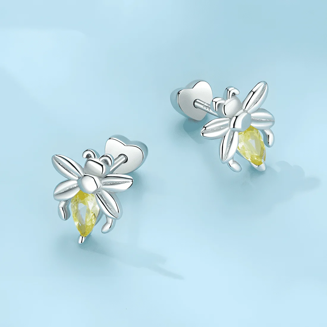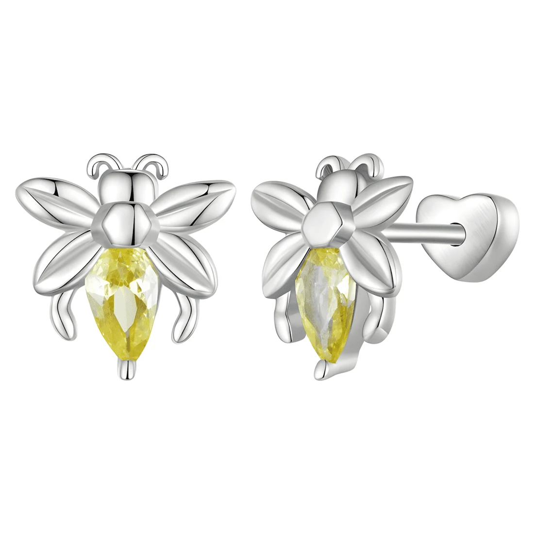 Bee Stud Earrings, 925 Sterling Silver, white gold plated, with yellow cubic zirconia.