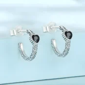Black Heart Hoop Earrings, 925 Sterling Silver, white gold plated, gothic style, with black cubic zirconia.