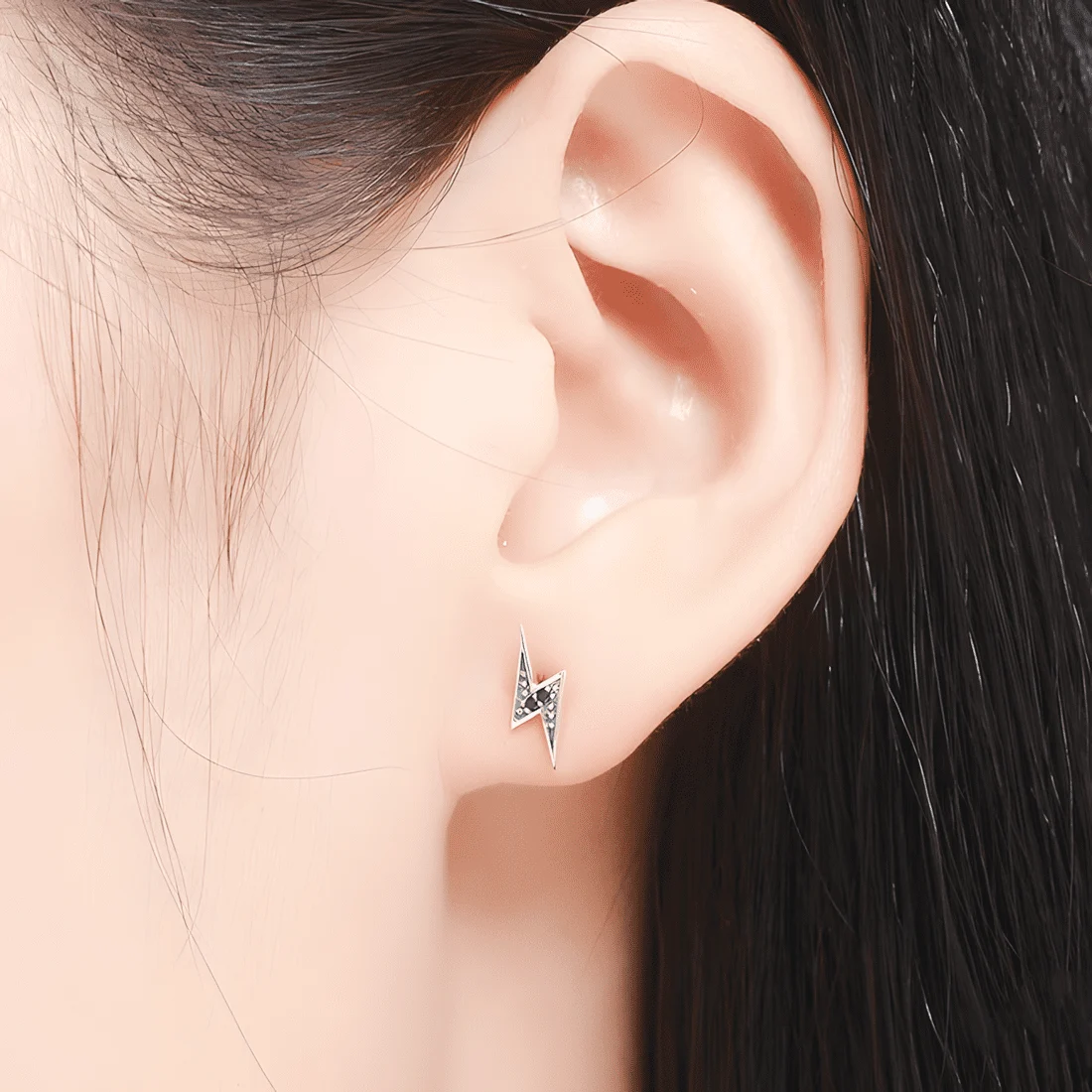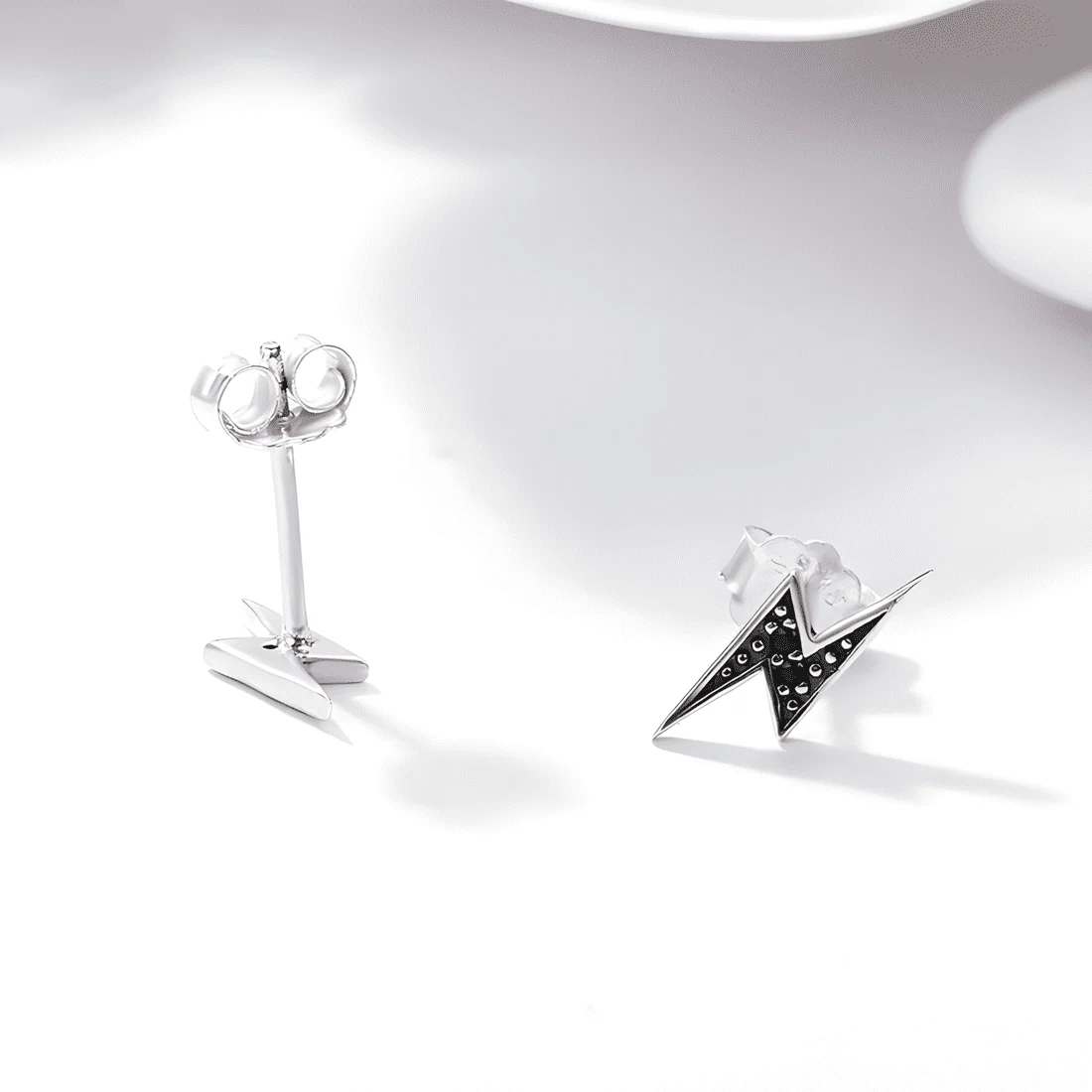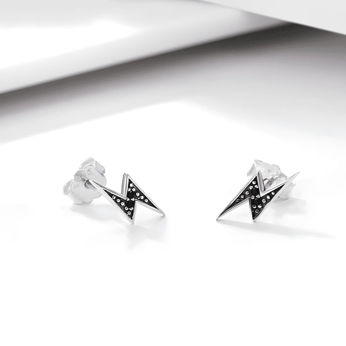 Black Lightning Stud Earrings, 925 Sterling Silver, white gold plated, with black cubic zirconia.