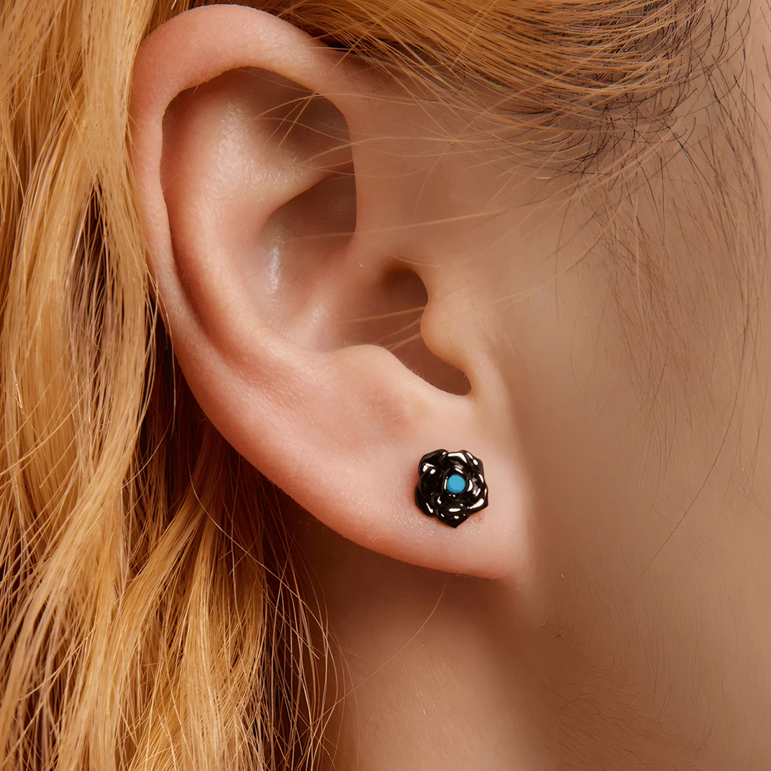 Black Rose Stud Earrings, 925 Sterling Silver, black plated, with blue cubic zirconia.
