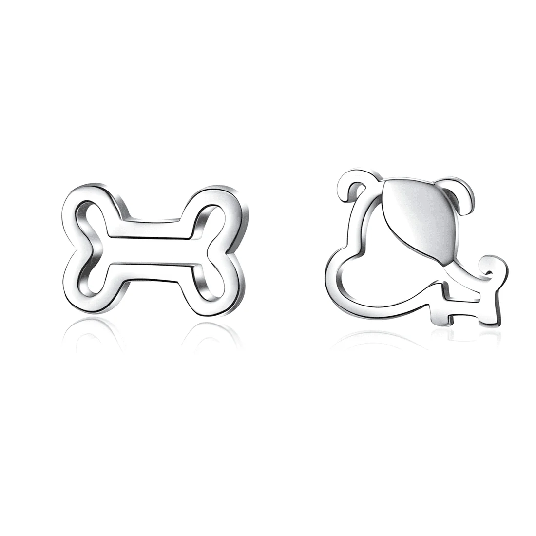 Dog with Bone Stud Earrings, 925 Sterling Silver, white gold plated.