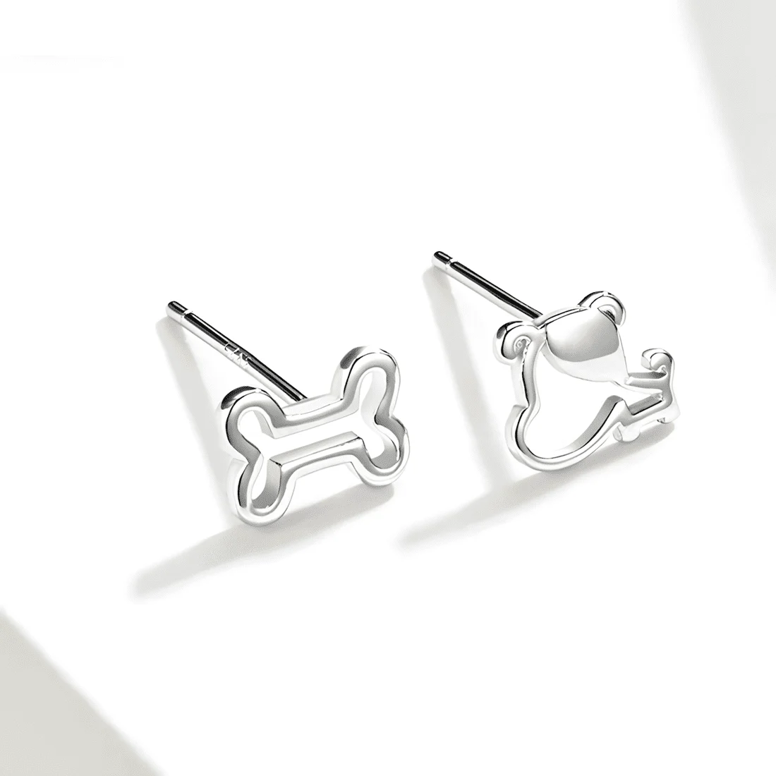 Dog with Bone Stud Earrings 925 Sterling Silver, white gold plated