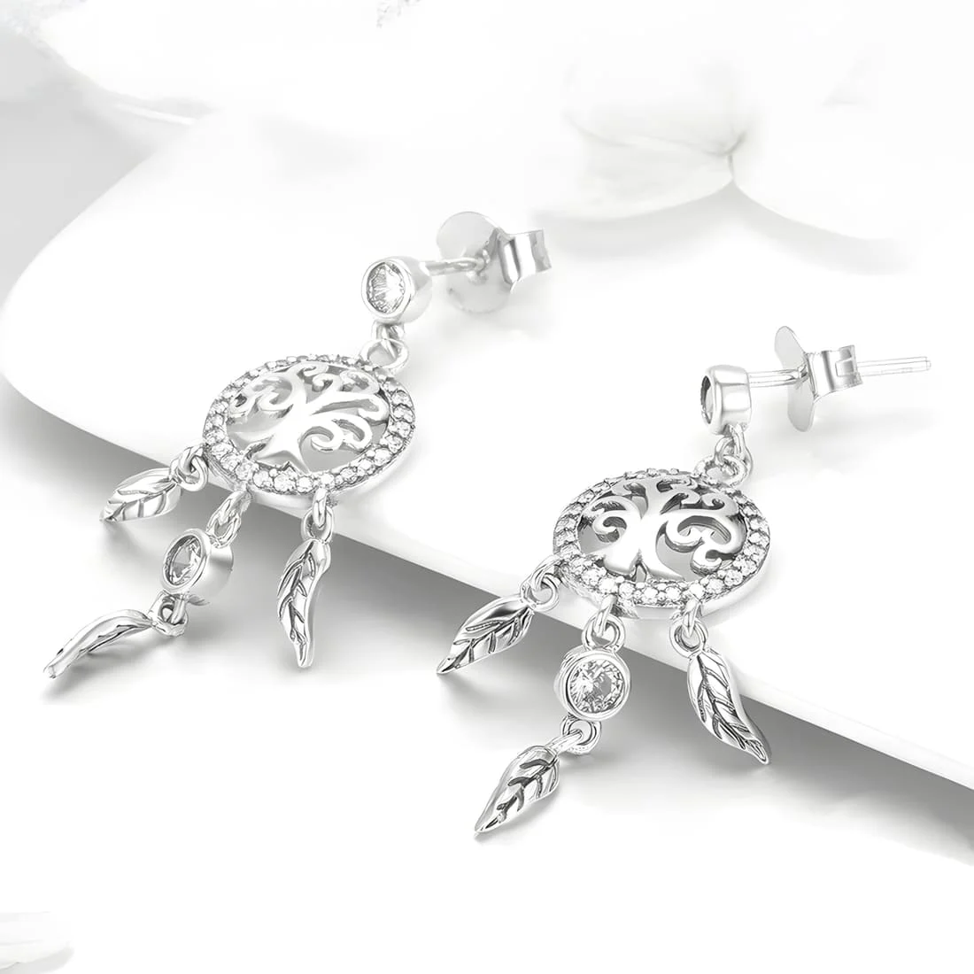 Dreamcatcher with Tree of Life Stud Earrings, 925 Sterling Silver, white gold plated, with cubic zirconia.