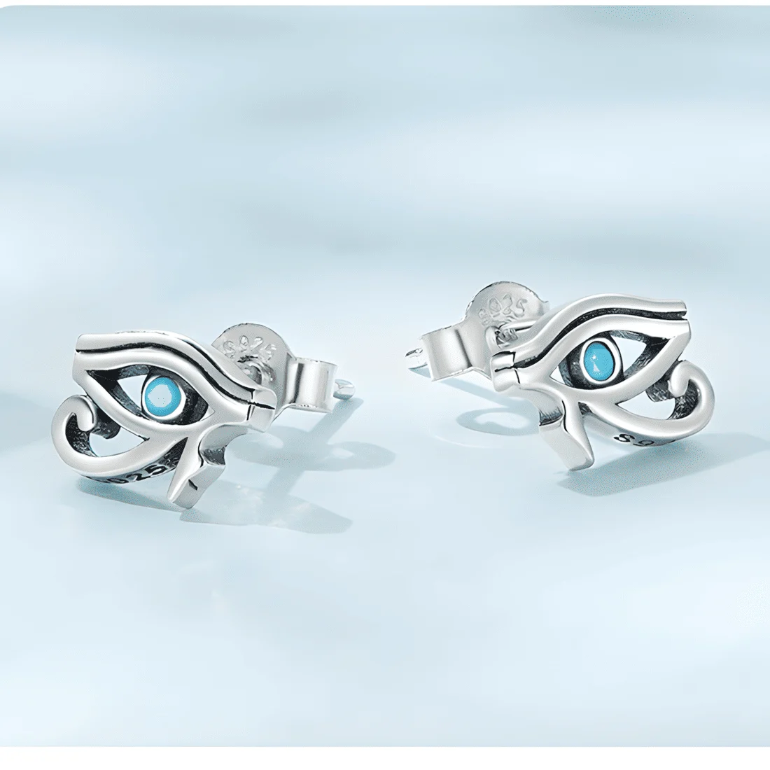Eye of Horus Stud Earrings, 925 Sterling Silver, white gold plated, with blue cubic zirconia.