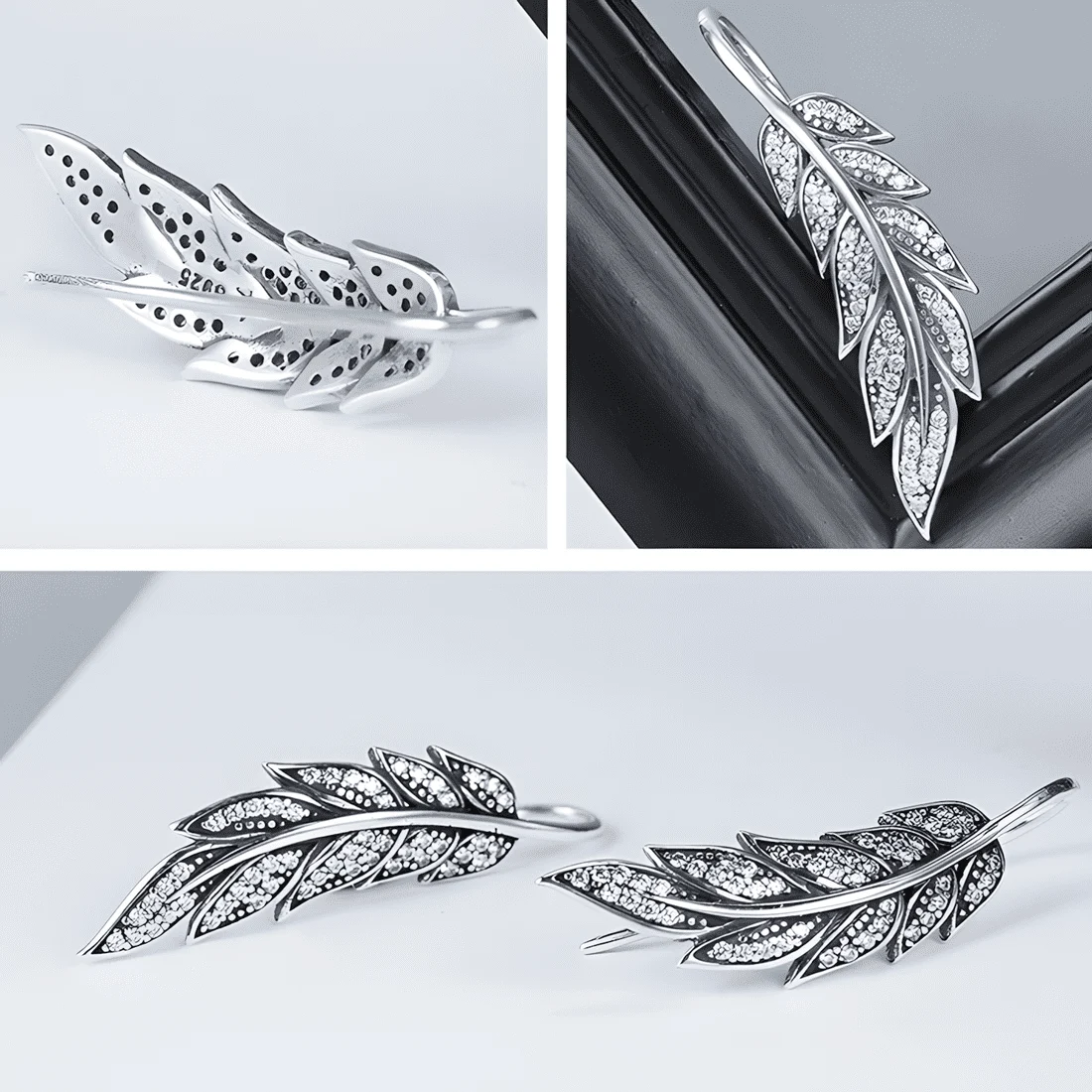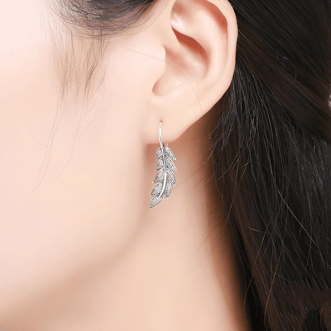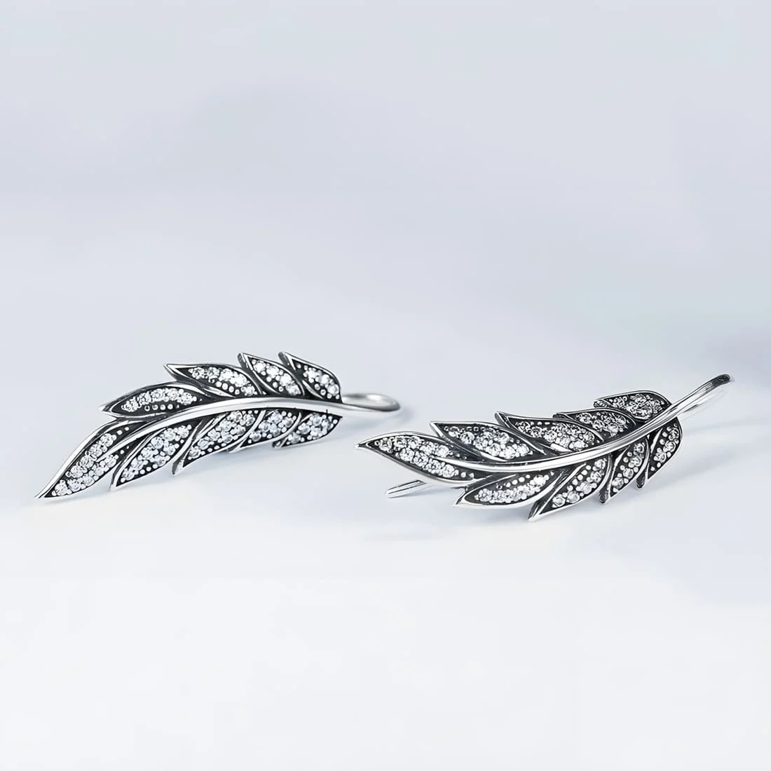 Feather Drop Earrings, 925 Sterling Silver, white gold plated, with cubic zirconia.