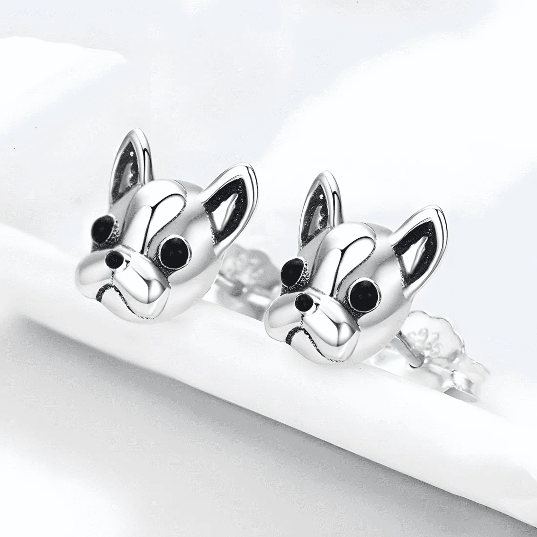 French Bulldog Dog Stud Earrings, 925 Sterling Silver, white gold plated.