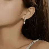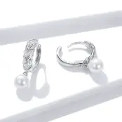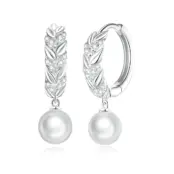 Leaves and Pearls Hoop Earrings, 925 Sterling Silver, white gold plated, with cubic zirconia and natural pearls.