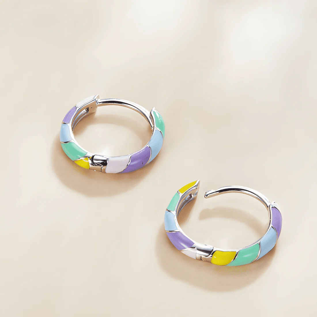 Pastel Enamel Hoop Earrings, 925 Sterling Silver, white gold plated, with multicolored enamel.