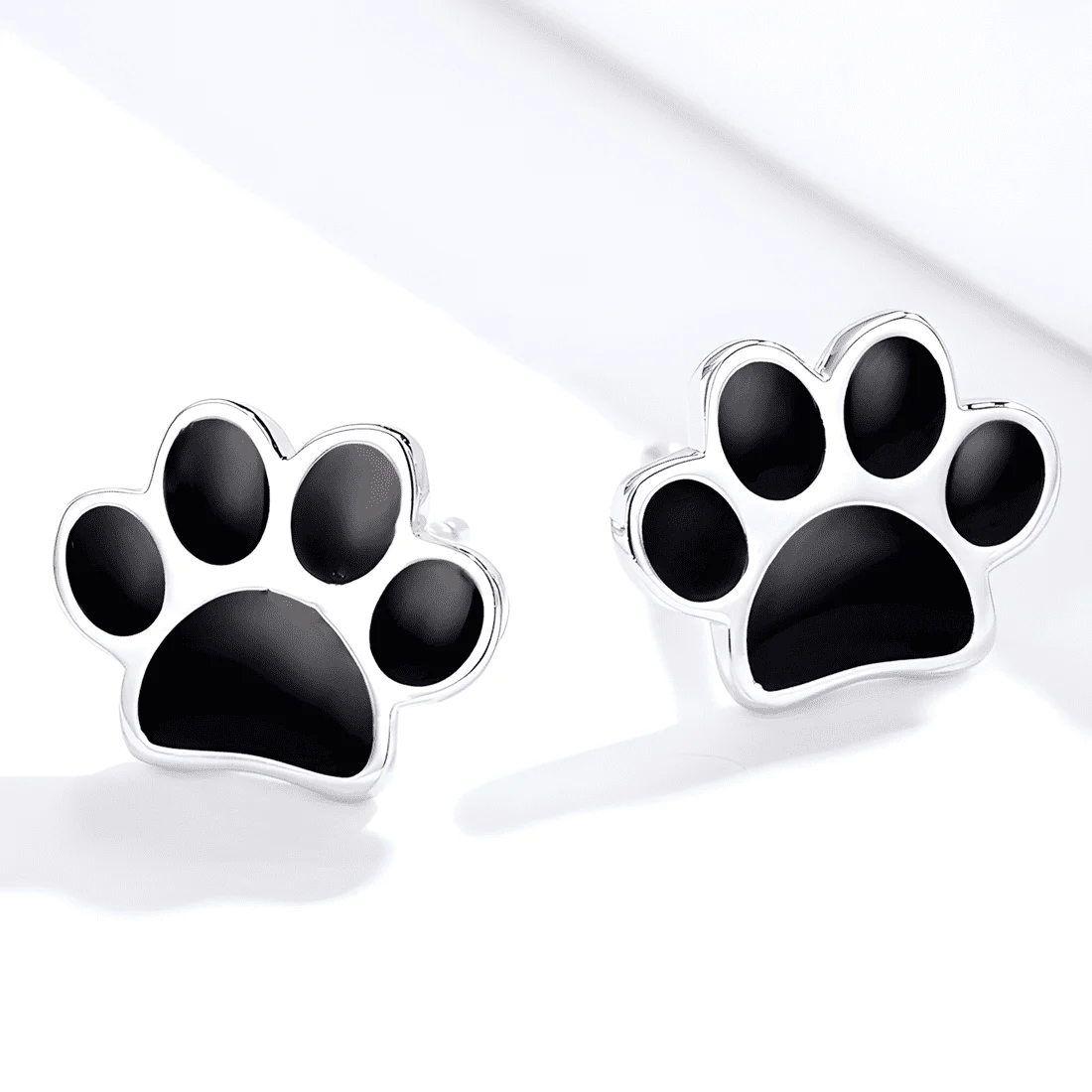 Paws Stud Earrings, 925 Sterling Silver, white gold plated, with black enamel.