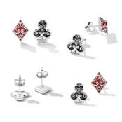 Poker Square and Flower Stud Earrings 925 Sterling Silver, white gold plated, with red and black enamel