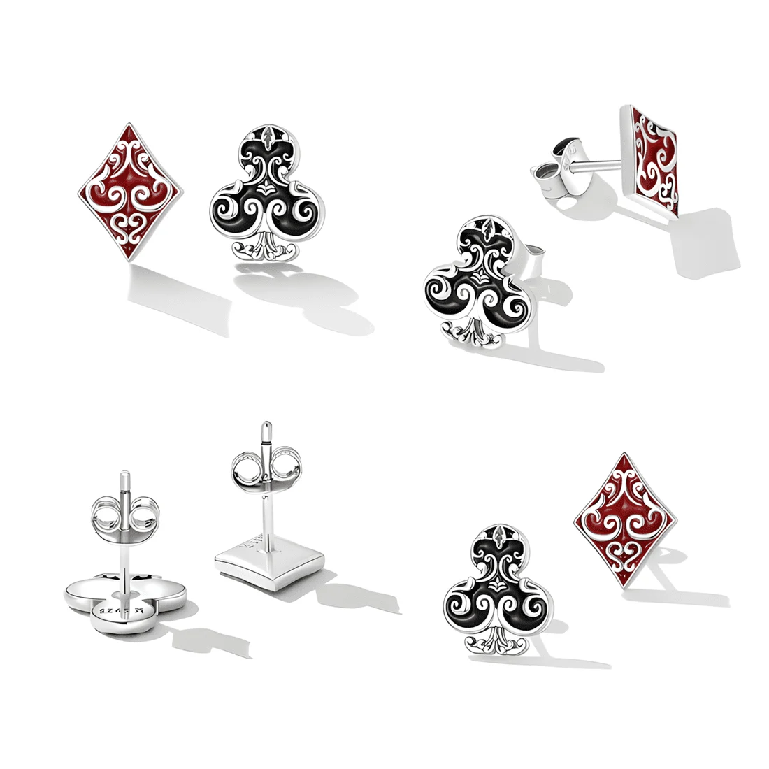 Poker Square and Flower Stud Earrings, 925 Sterling Silver, white gold plated, with red and black enamel.