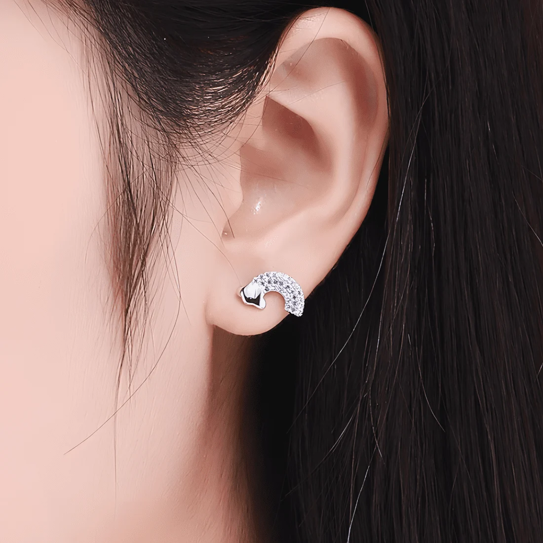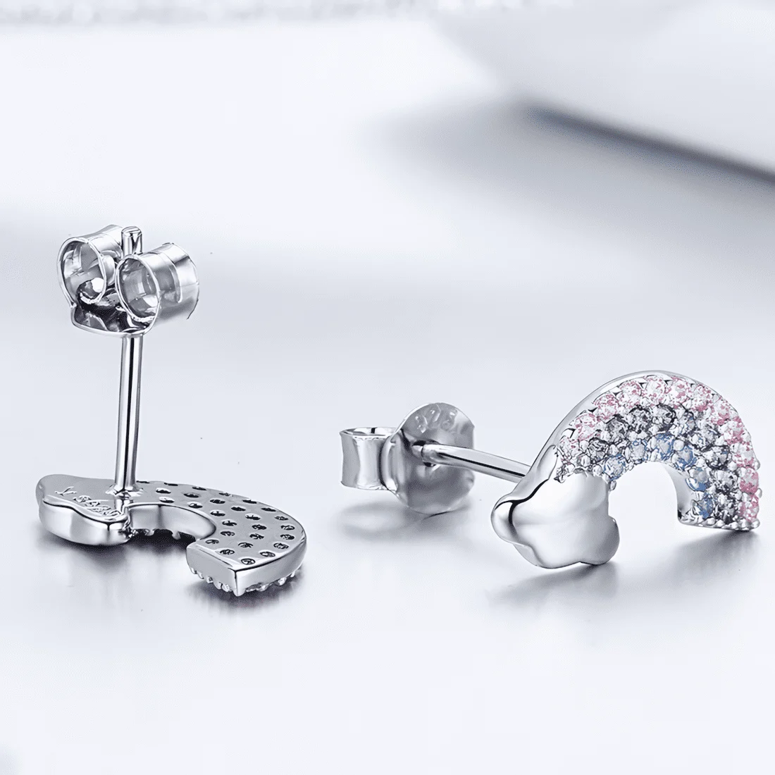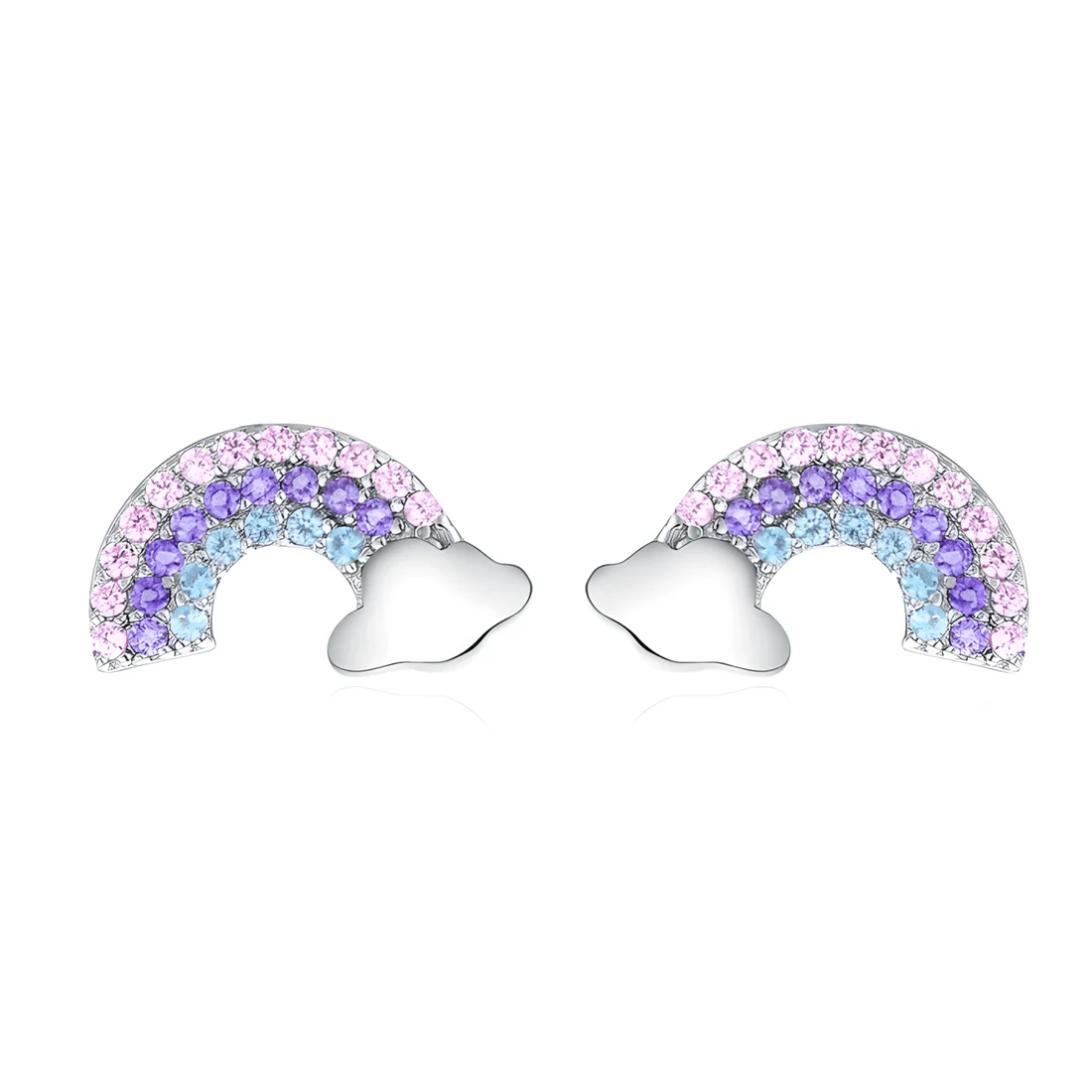 Rainbow Cloud Stud Earrings, 925 Sterling Silver, white gold plated, with multicolored cubic zirconia.