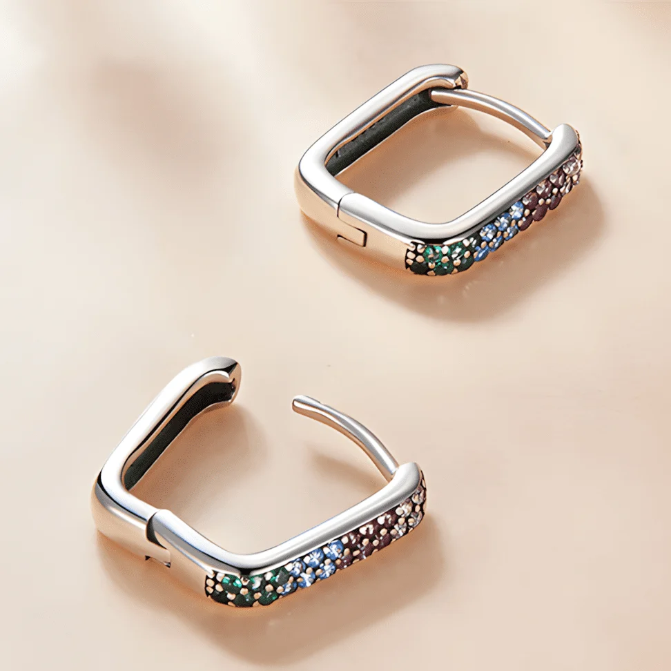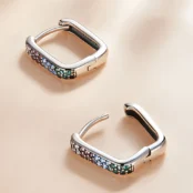 Rainbow Rectangular Hoop Earrings 925 Sterling Silver, white gold plated, with multi-colored cubic zirconia