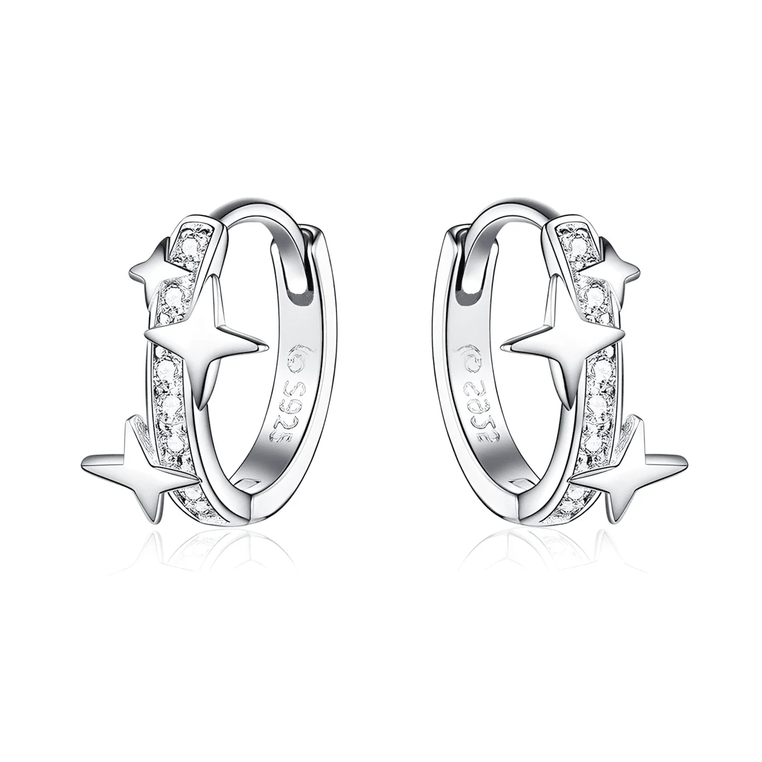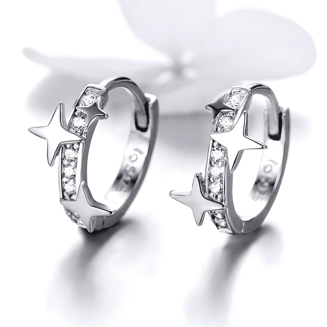 Stars Hoop Earrings, 925 Sterling Silver, white gold plated, with cubic zirconia.