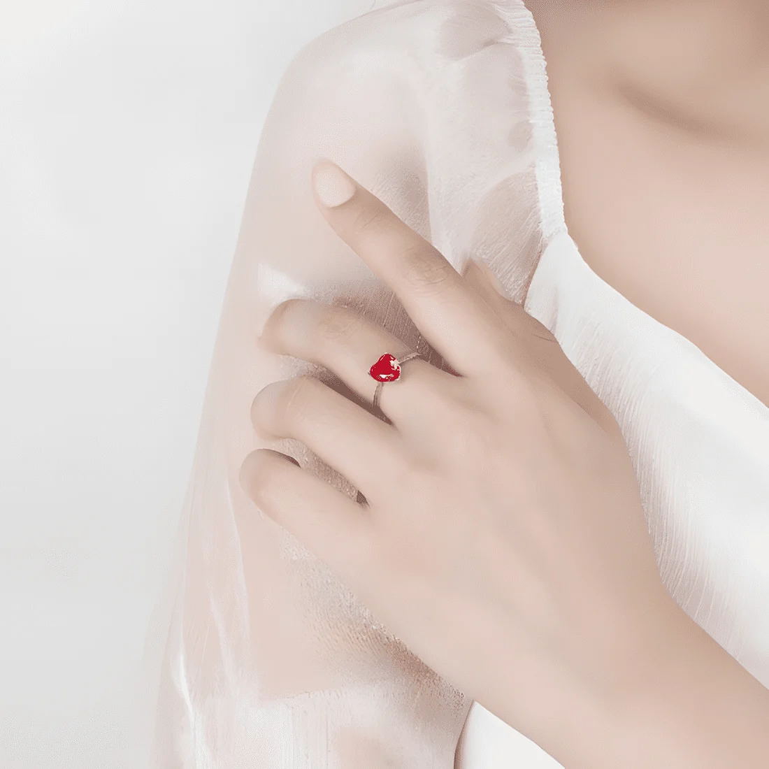Heart Jewellery Set 925 Sterling Silver, white gold plated, necklace, earrings, and adjustable ring, with red cubic zirconia