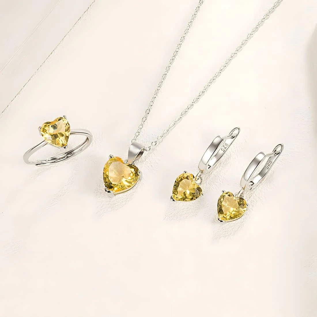 Heart Jewellery Set 925 Sterling Silver, white gold plated, necklace, earrings, and adjustable ring, with yellow cubic zirconia