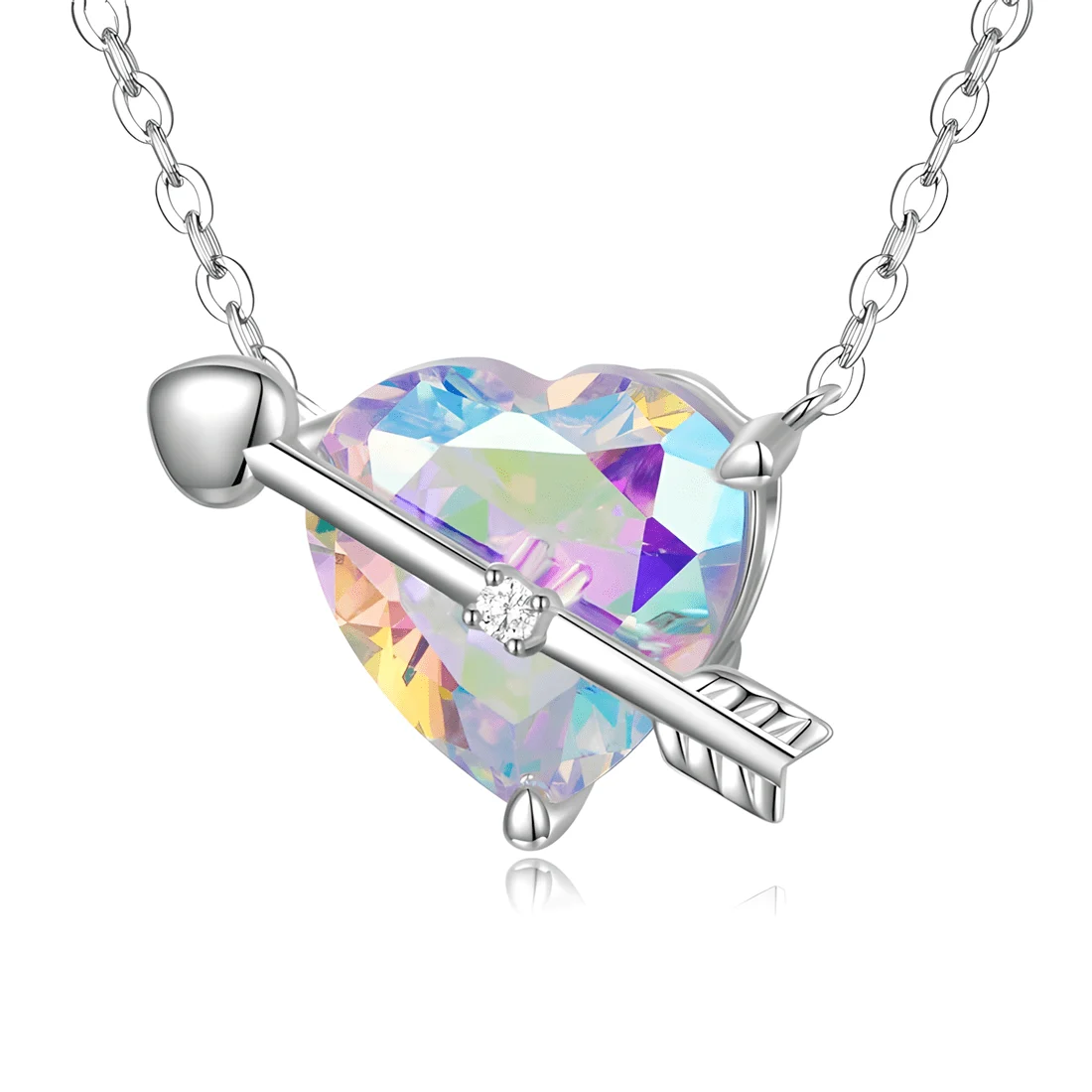 Cupid’s Heart Necklace, 925 Sterling Silver, white gold plated, with iridescent heart-shaped crystal and adjustable length.