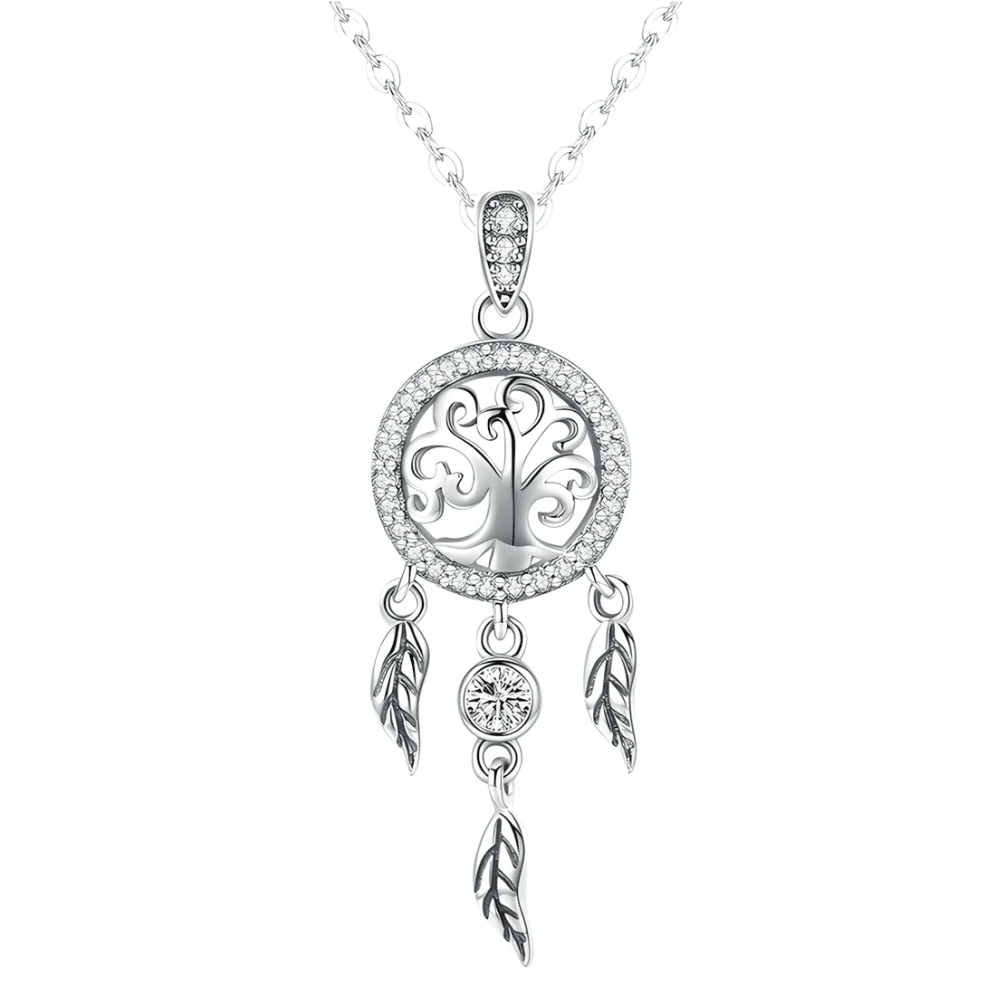 Dreamcatcher with Tree of Life Necklace, 925 Sterling Silver, white gold plated, with cubic zirconia.