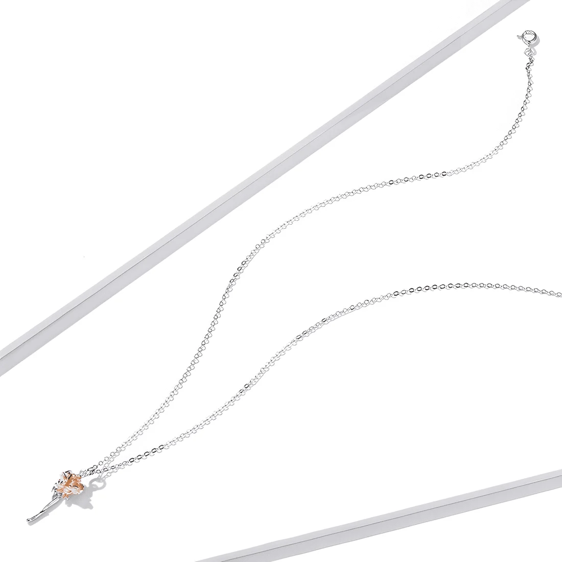 Golden Rose Necklace, 925 Sterling Silver, white gold plated, with rose gold plated petals and adjustable length.