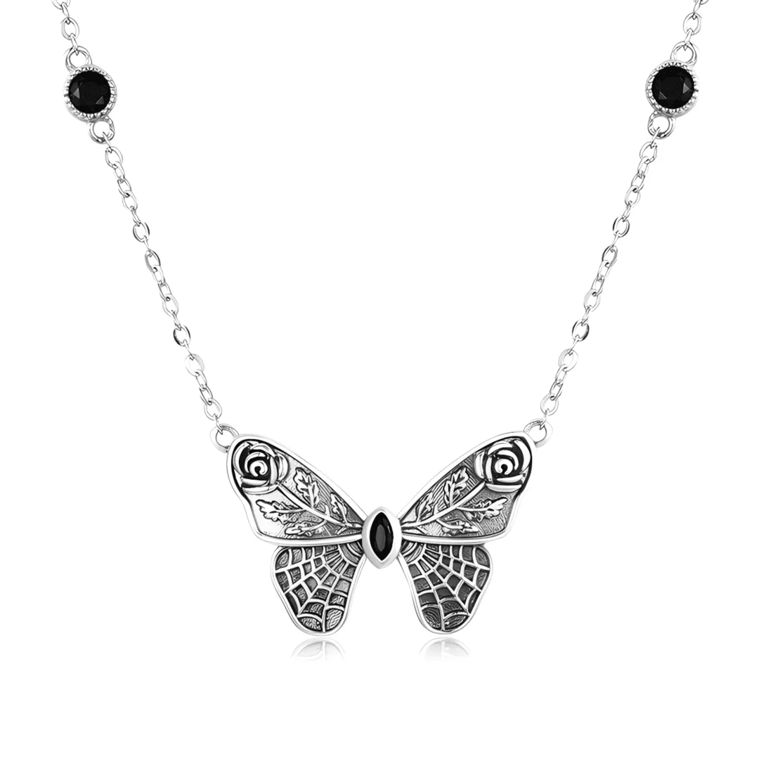 Gothic Butterfly Necklace 925 Sterling Silver, white gold plated, with black cubic zirconia and adjustable length