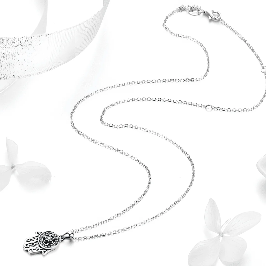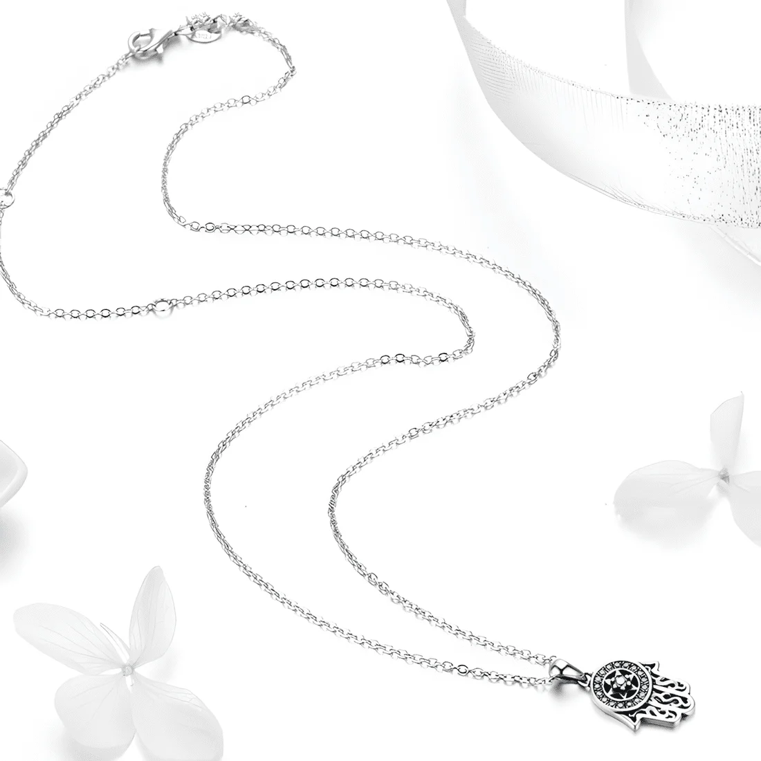 Hamsa Necklace, 925 Sterling Silver, white gold plated, with blue cubic zirconia and adjustable length.