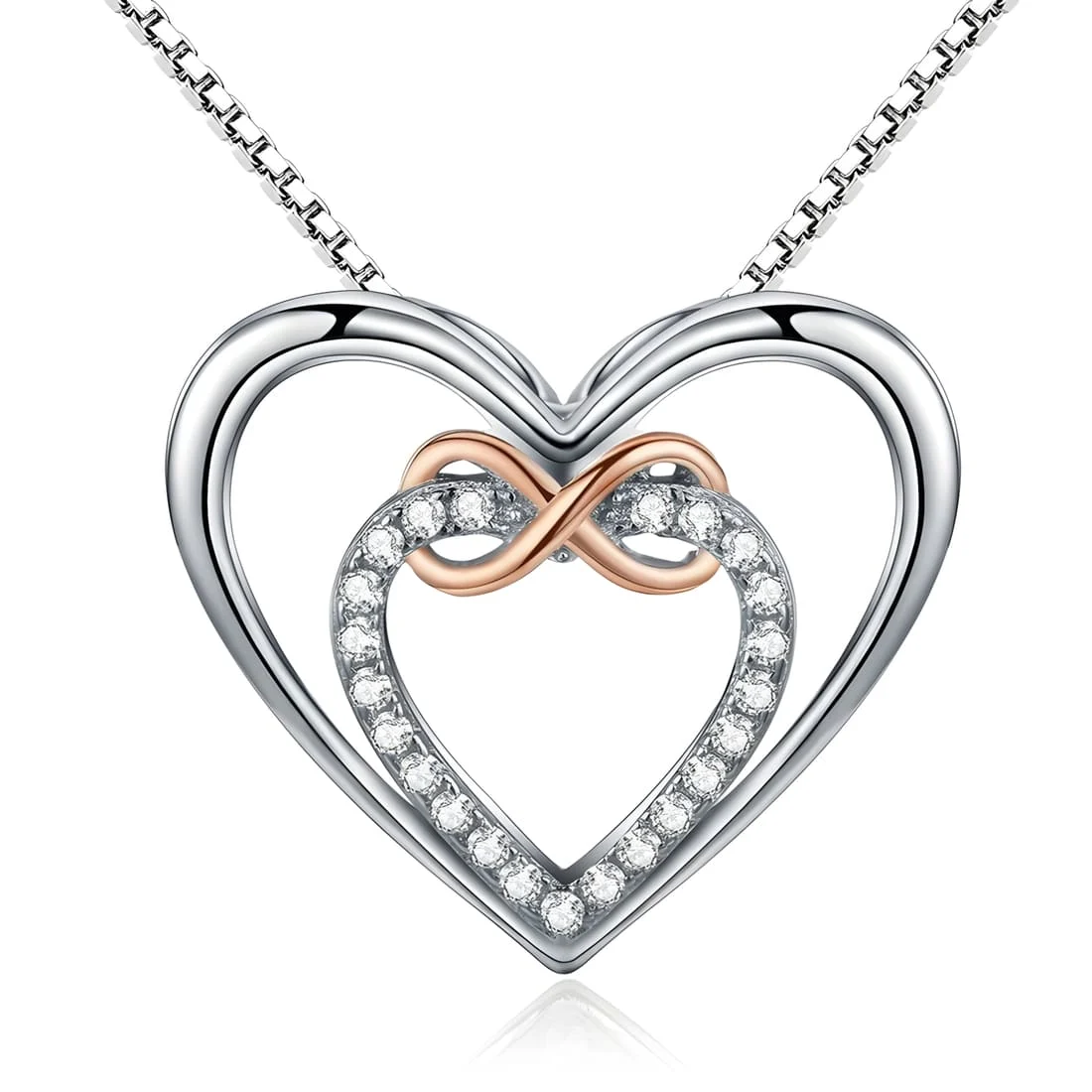 Hearts Necklace, 925 Sterling Silver, white gold plated, with rose gold accent and cubic zirconia.