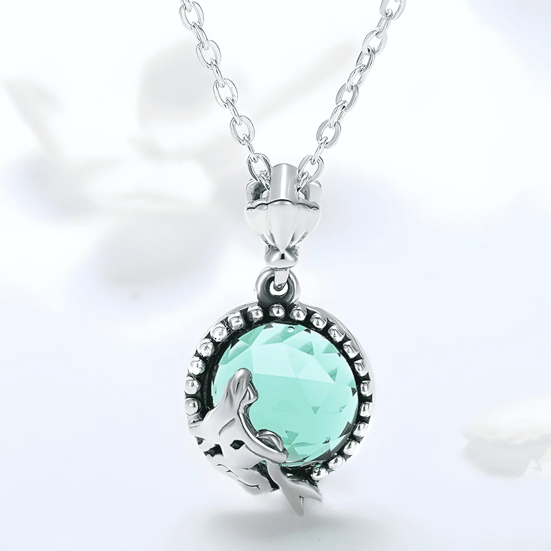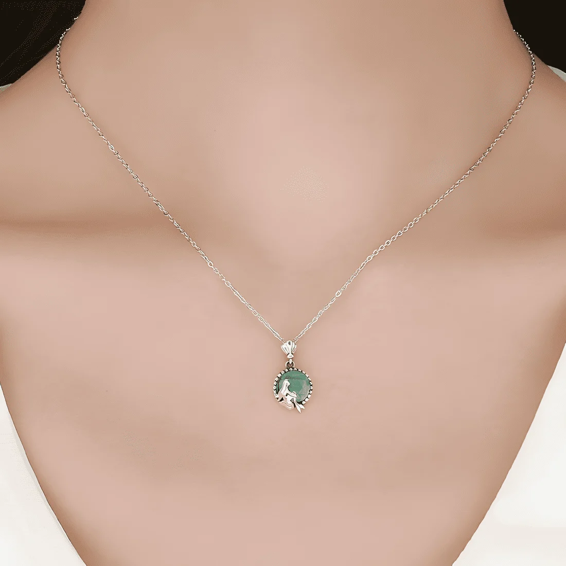Mermaid Necklace, 925 Sterling Silver, white gold plated, with aqua green crystal.