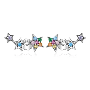 Stars Stud Earrings 925 Sterling Silver, white gold plated, with colored cubic zirconia