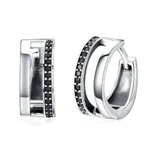 Double Hoop Earrings 925 Sterling Silver, white gold plated, with black cubic zirconia