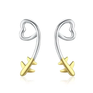 Airplane Heart Earrings 925 Sterling Silver, white gold plated, with yellow gold plated airplane detail