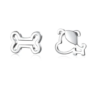 Dog with Bone Stud Earrings 925 Sterling Silver, white gold plated