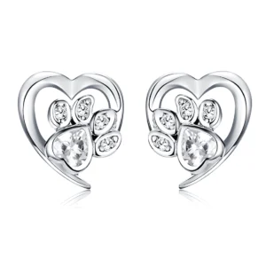 Heart Paw Stud Earrings 925 Sterling Silver, white gold plated, with cubic zirconia