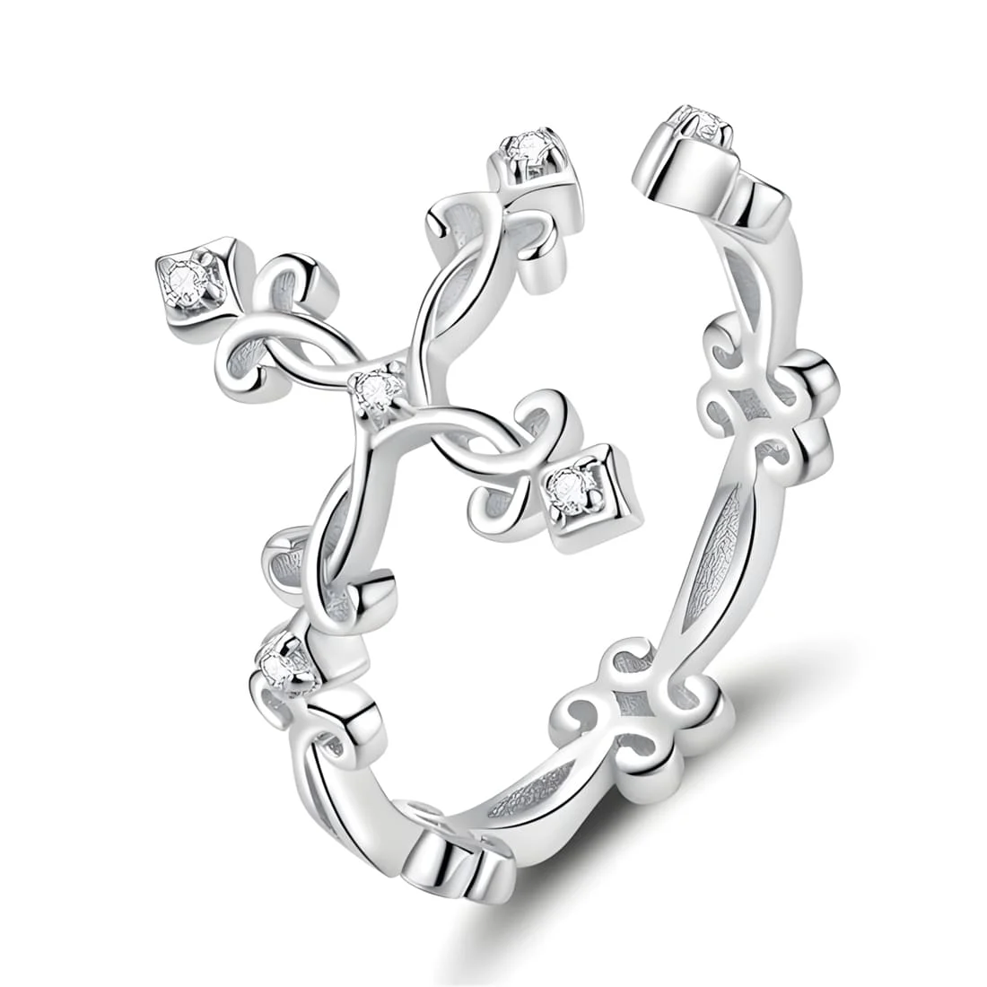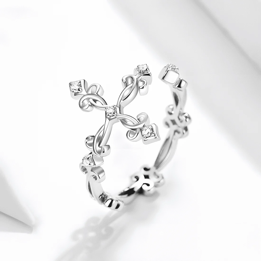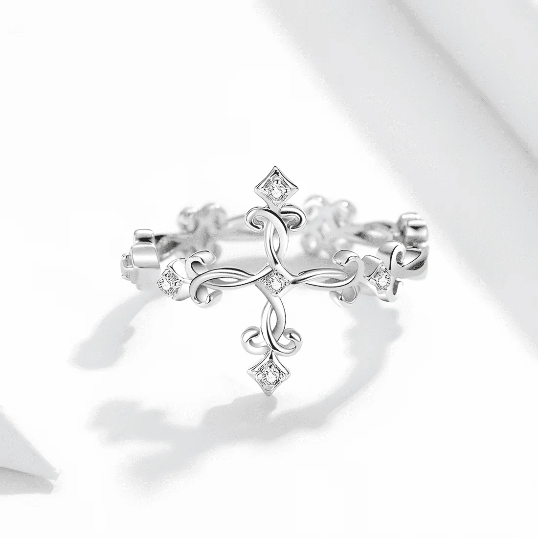 Ancient Cross Ring 925 Sterling Silver, white gold plated, with cubic zirconia – adjustable