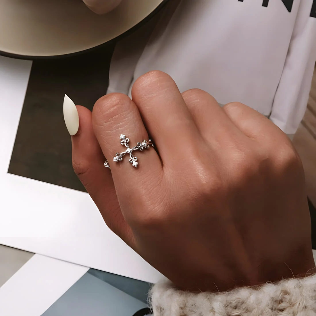 Ancient Cross Ring, 925 Sterling Silver, white gold plated, with cubic zirconia – adjustable.