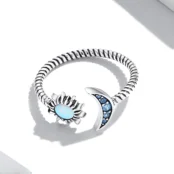 Celestial Sun and Moon Ring, 925 Sterling Silver, white gold plated, with opal and blue cubic zirconia – adjustable.