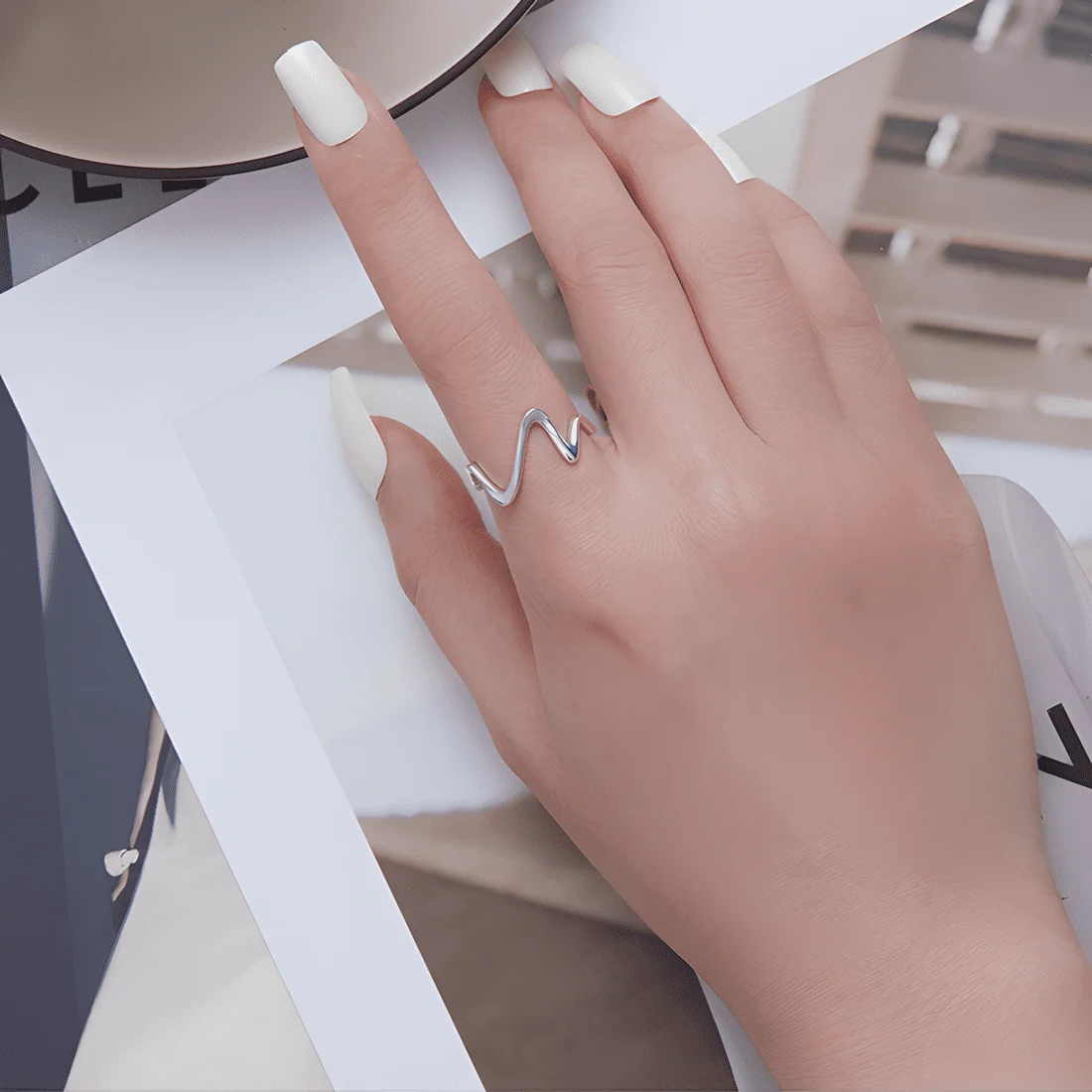 ECG Ring, 925 Sterling Silver, white gold plated – adjustable.