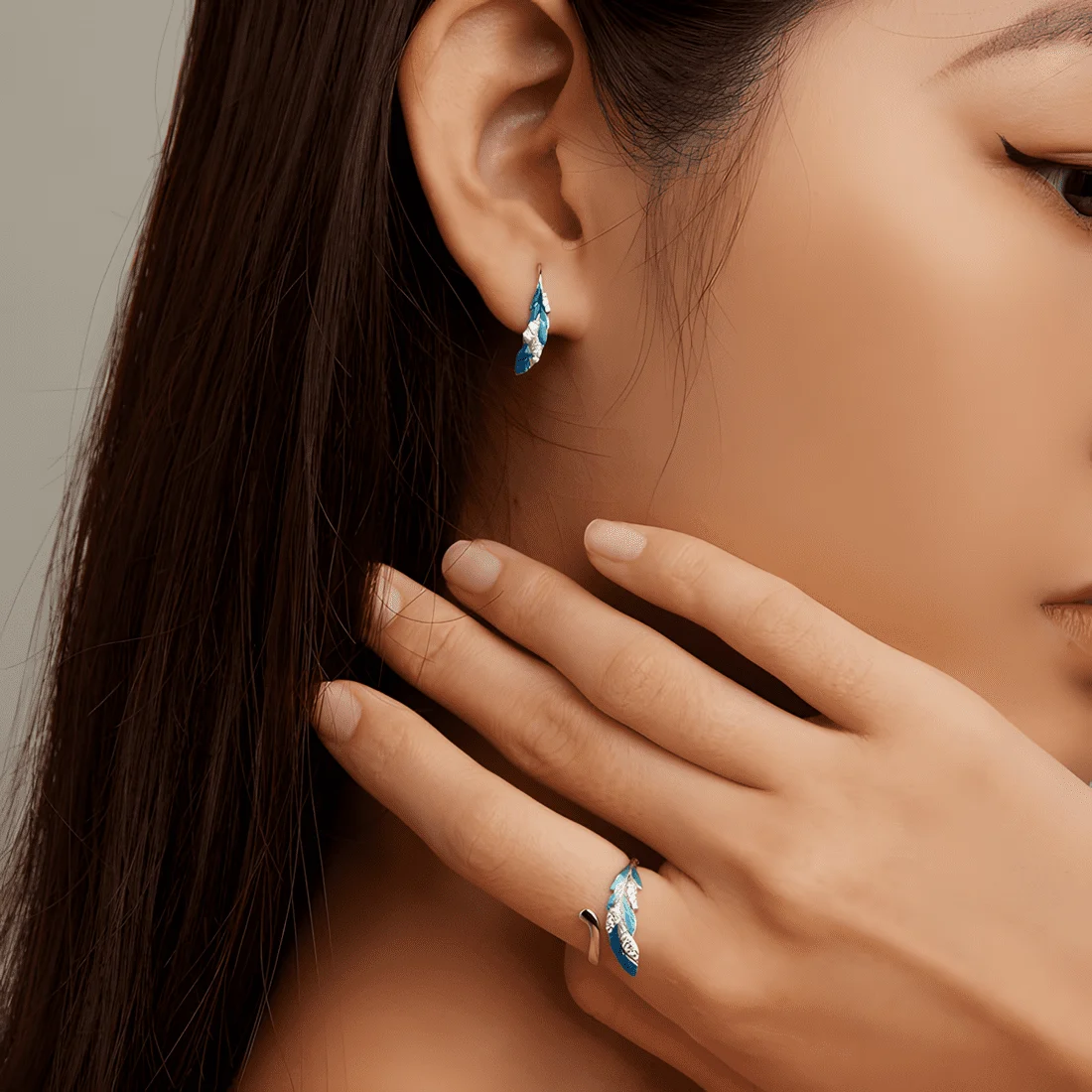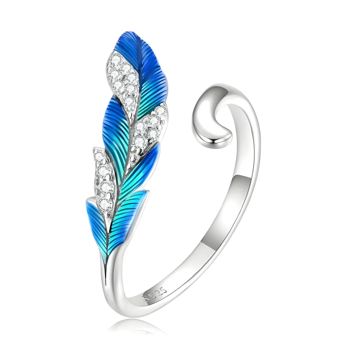Feather Ring, 925 Sterling Silver, white gold plated, hand-enameled, with cubic zirconia – adjustable.