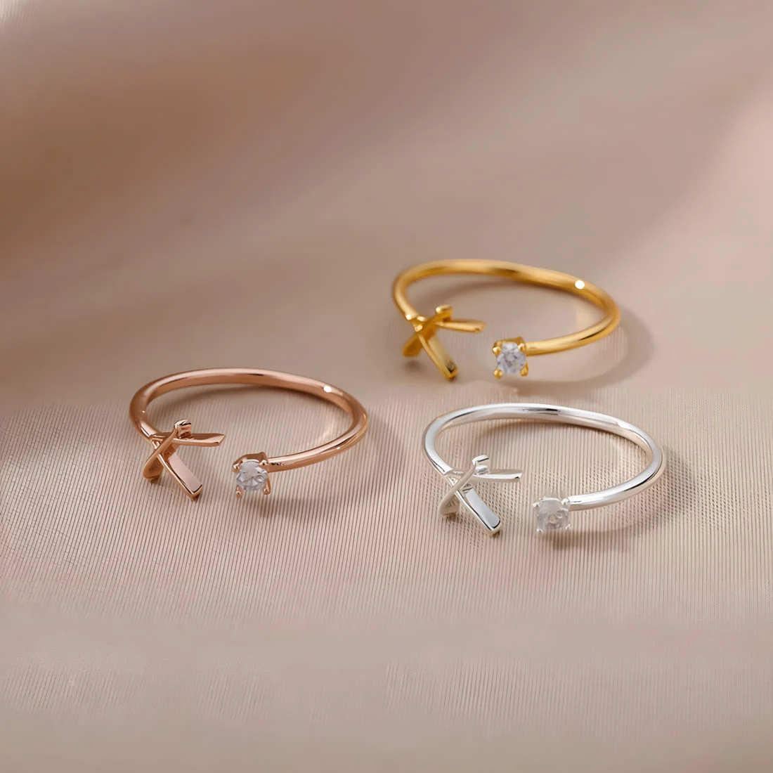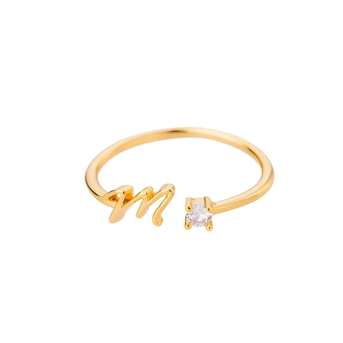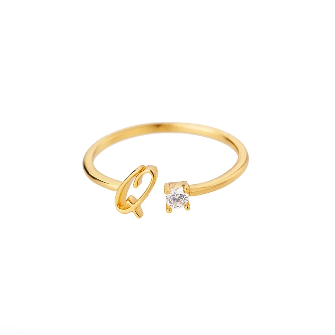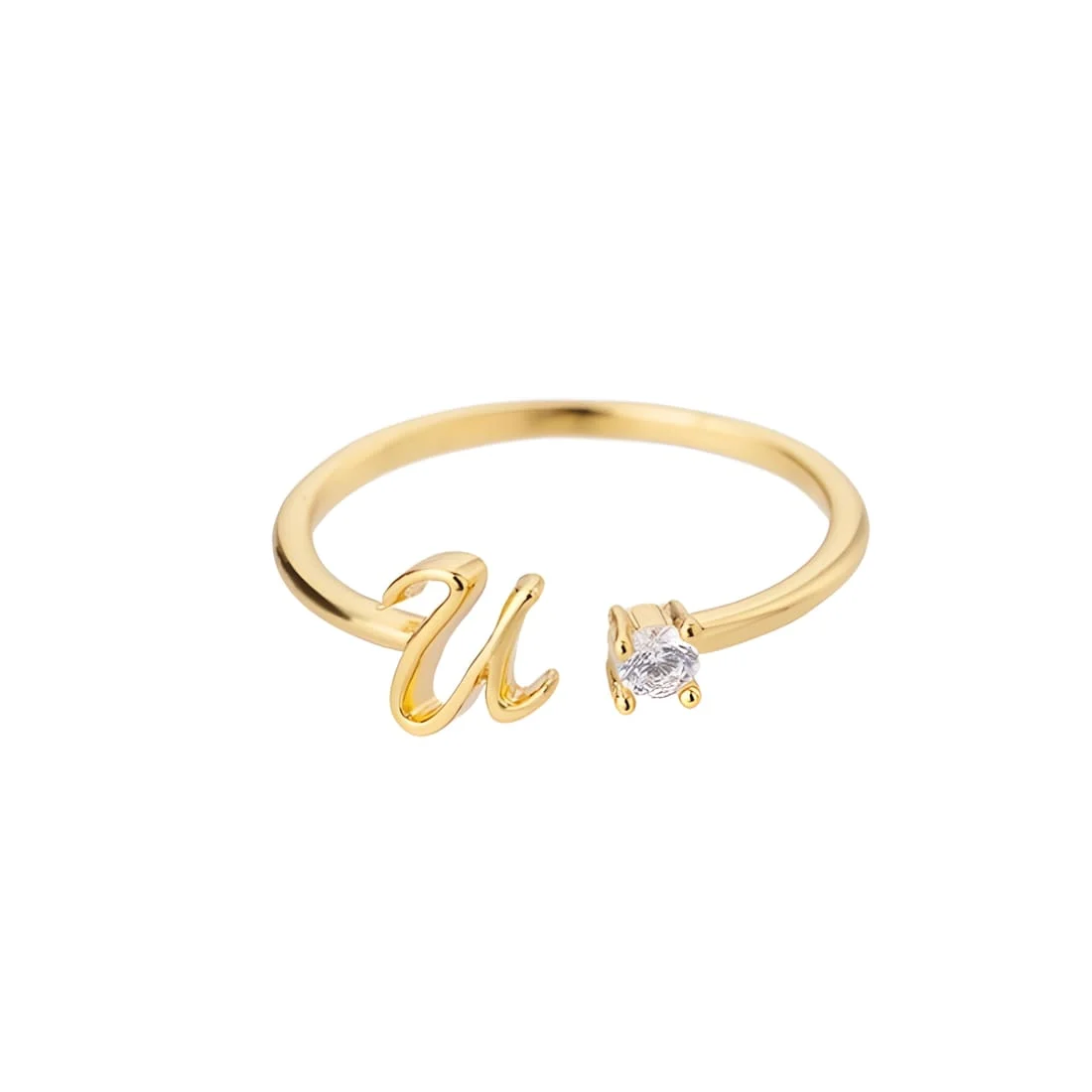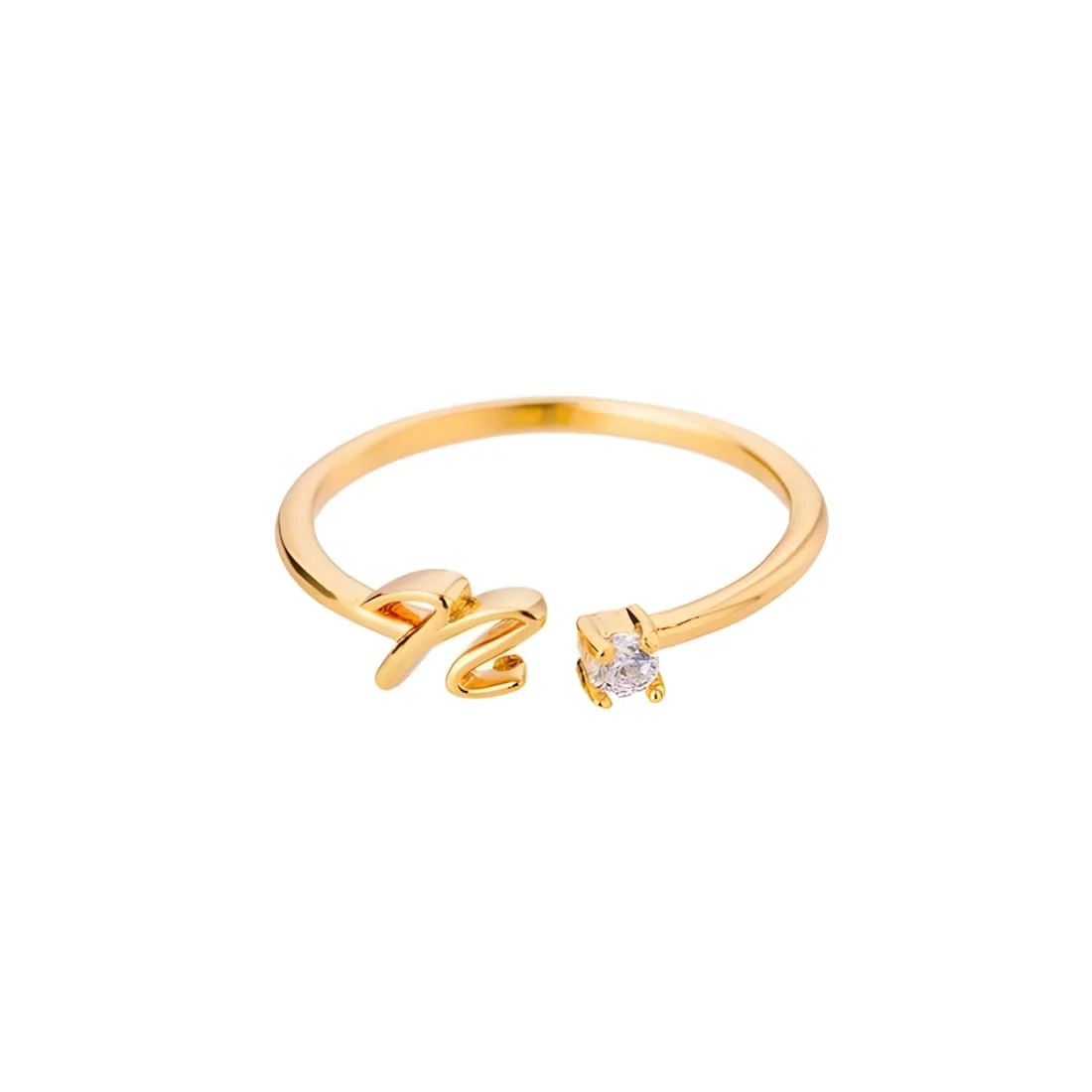 Initial Letter Ring, Stainless steel, white, yellow or pink gold plated, with cubic zirconia – adjustable.