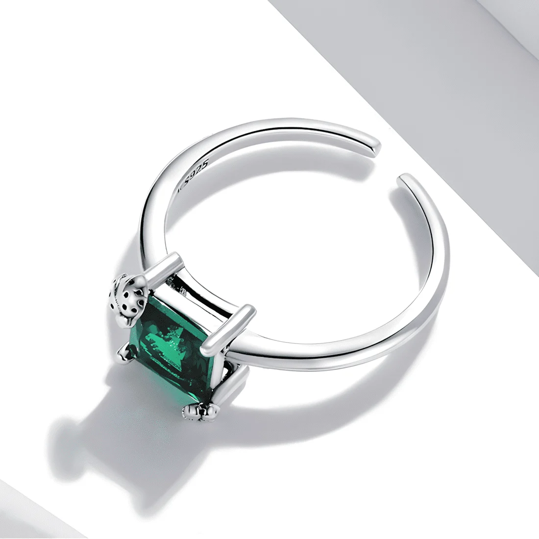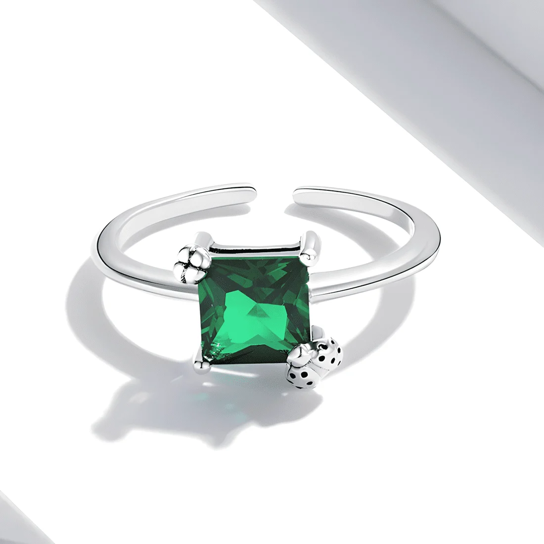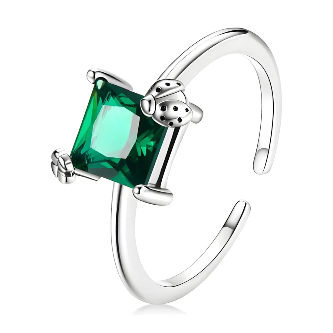 Ladybug Emerald Ring, 925 Sterling Silver, white gold plated, with green cubic zirconia – adjustable.
