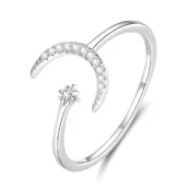 Moon and Comet Star Ring, 925 Sterling Silver, white gold plated, with cubic zirconia – adjustable.