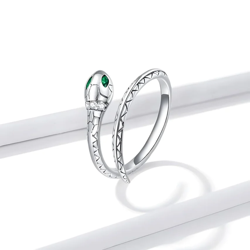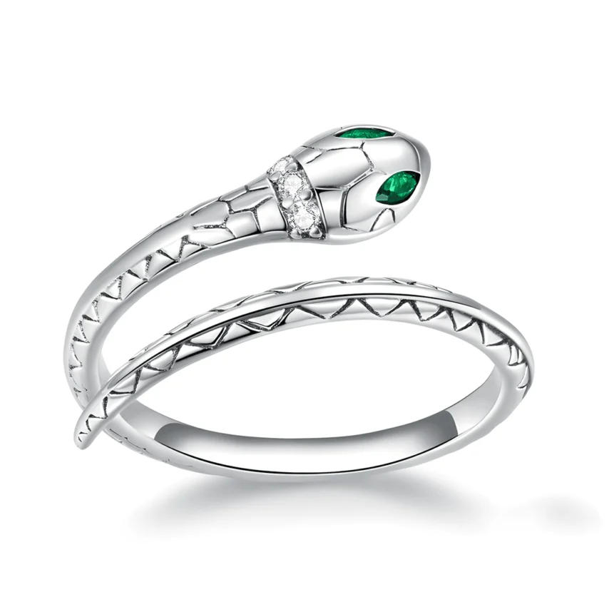 Snake Ring, 925 Sterling Silver, white gold plated, with green and white cubic zirconia – adjustable.